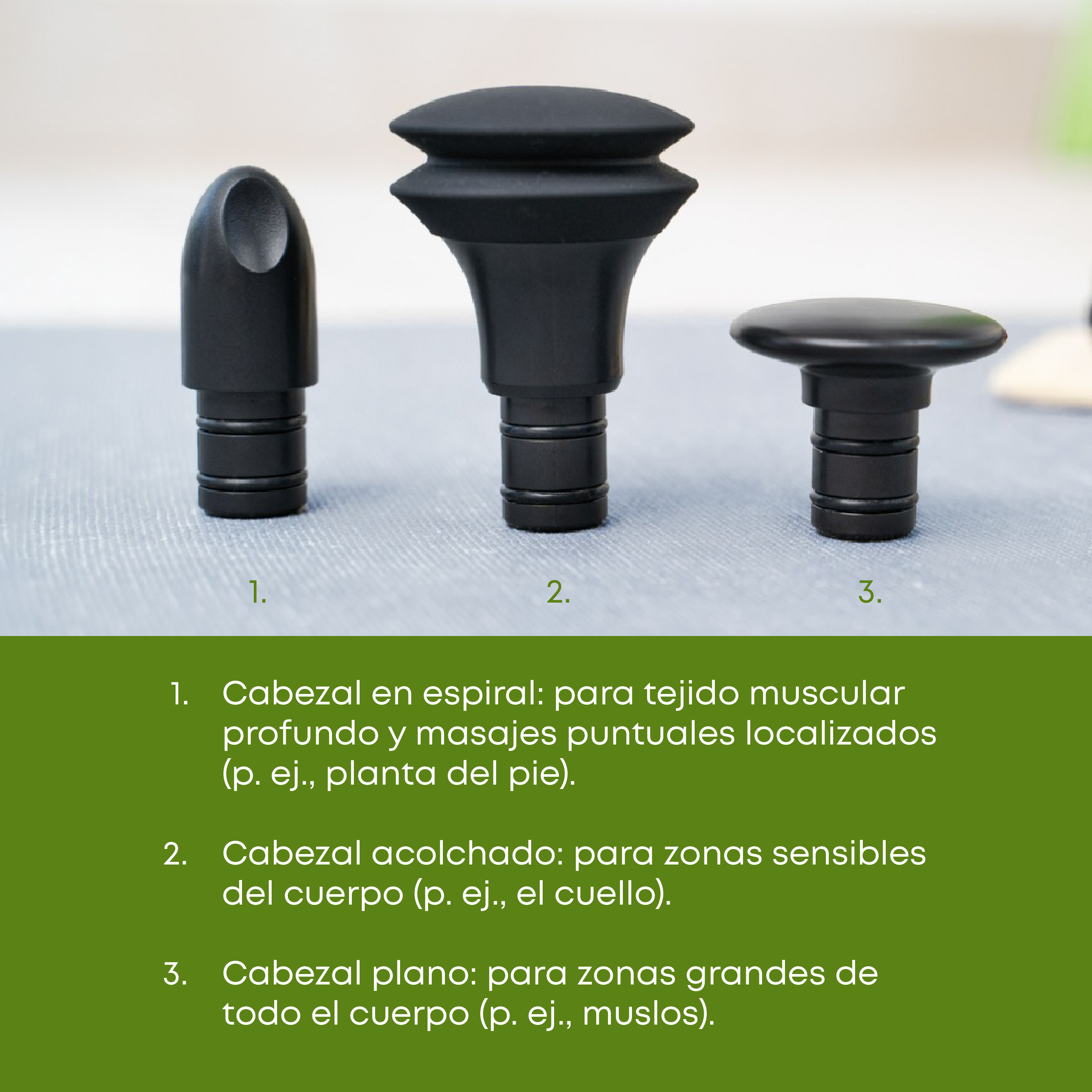 Cuenta con 3 cabezales intercambiables que se adaptan a cada necesidad, permitiendo un masaje personalizado en cualquier parte del cuerpo con precisión y comodidad.