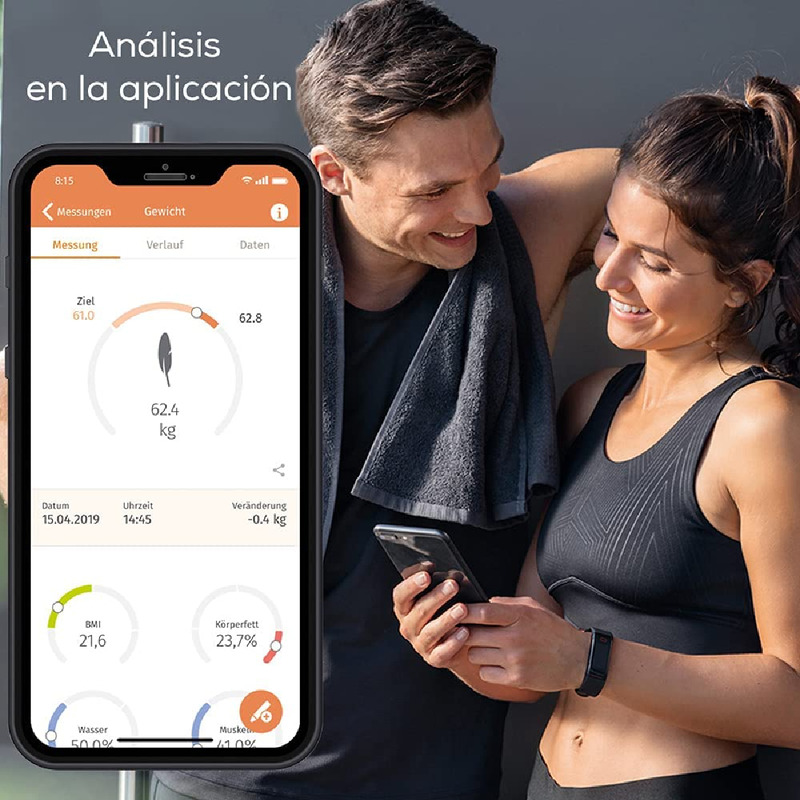 .ANÁLISIS PRECISO DE TODO EL CUERPO: Además de su peso, la báscula corporal también determina la grasa corporal, el porcentaje muscular, el agua corporal, la masa ósea, así como la rotación básica y de actividad. Los valores de grasa corporal y porcentaje muscular se pueden mostrar por separado para la parte superior e inferior del cuerpo.