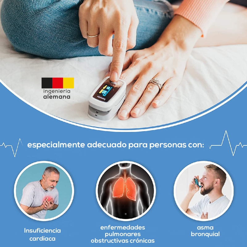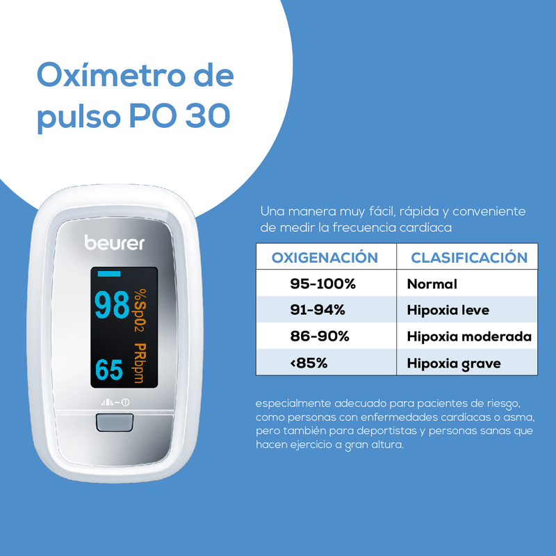 El PO 30 ofrece una forma asequible, fiable y precisa de comprobar su frecuencia de pulso y los niveles de saturación de oxígeno en la sangre, en cualquier lugar . El oxímetro de pulso cuenta con una operación de un botón para determinar los niveles de saturación de oxígeno en la sangre (SpO2) así como la frecuencia auditiva (pulso).Diseñado para entusiastas del deporte, aviadores, ciclistas, escaladores de montaña , enfermedades respiratorias como el asma, la EPOC, la COVID.19, la COVID de larga duración, así como otras enfermedades pulmonares que pueden provocar un descenso de la saturación de oxígeno y cualquier otra persona que quiera medir y supervisar su SpO2 a su conveniencia.