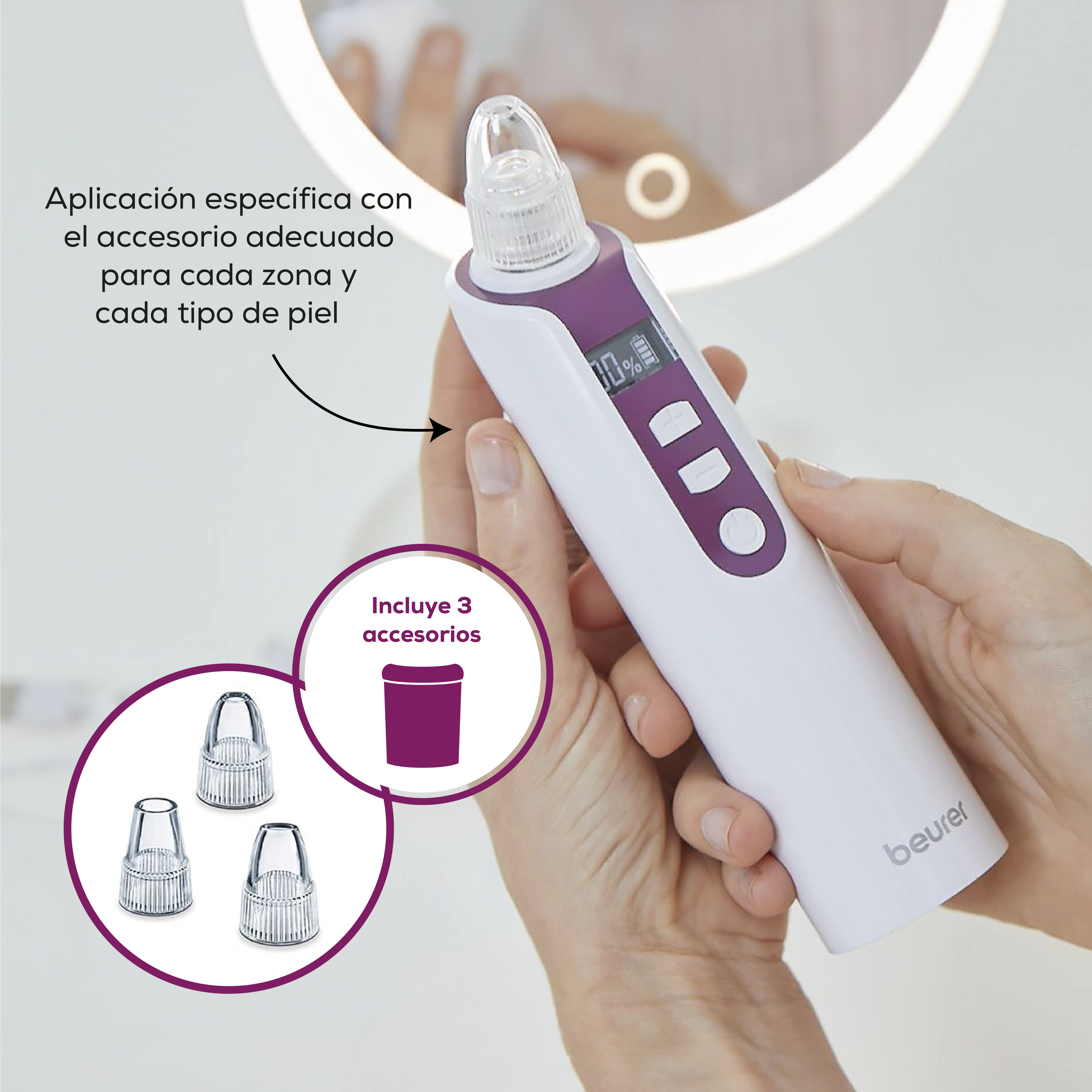 3 accesorios en distintos tamaños para distintos campos de aplicación en el rostro